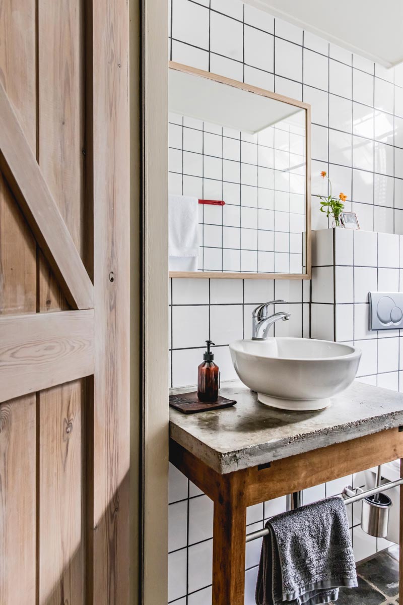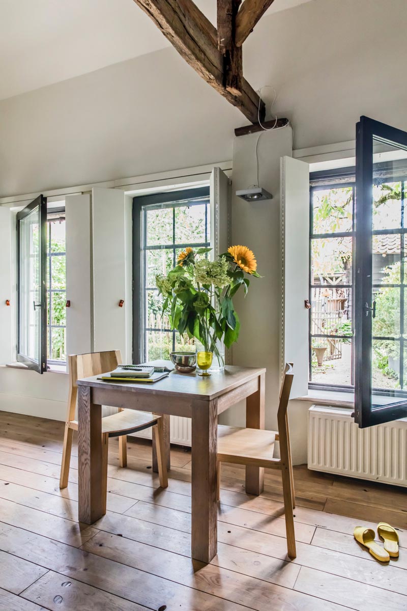 Een creatieve verbouwing was nodig om ruimte en wooncomfort te creĆ«ren voor het echtpaar en hun drie kinderen. Al snel kwam de kippenschuur in het vizier als potentieel woonvertrek voor de twee puberzoons. Jan, zelf architect, maakte het ontwerp. āHet respect voor het gebouw stond daarbij voorop, net als bij de verbouwing van onze boerderij. Eenvoud was de rode draad. We wilden geen tierelantijnen die zouden afleiden van het gebouw.ā Beeldbepalend zijn de originele, roede-verdeelde ramen van ijzer in een van de gevels. Ze waren verroest en versleten, maar zijn bewust niet gerestaureerd. āMet een laag zwarte Hammerite ging het wel weer.ā Voorzetramen in dezelfde industriĆ«le zwarttint voorkomen binnen een koude luchtstroom. Op de vloer liggen douglasplanken met een whitewash finish. De kleur van het hout matcht met de tint van de eikenbalken. Fraai ook zijn de originele dakpannetjes in verweerd oranje en grijs. Ze bleven in het zicht onder de overkapping, waar ze voor een nostalgisch sfeertje zorgen.