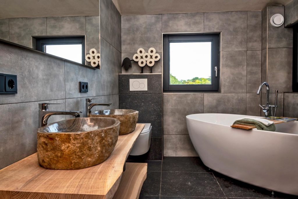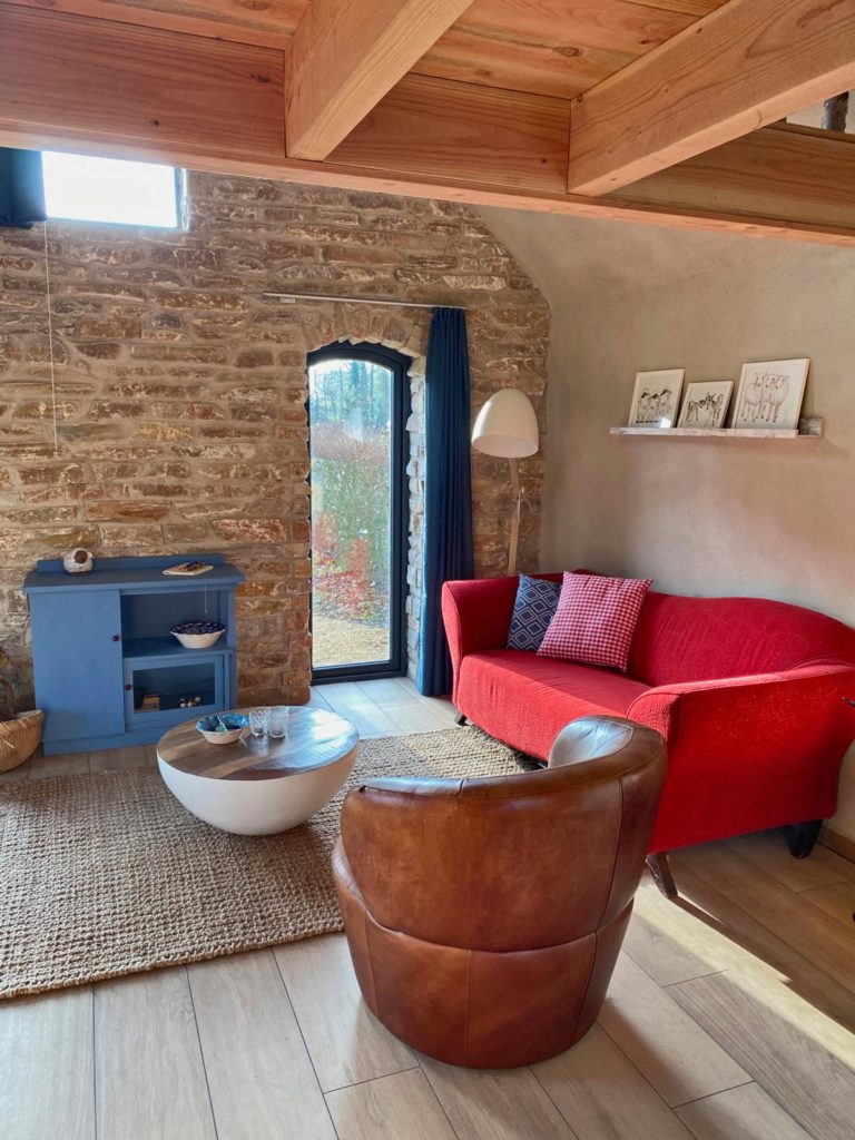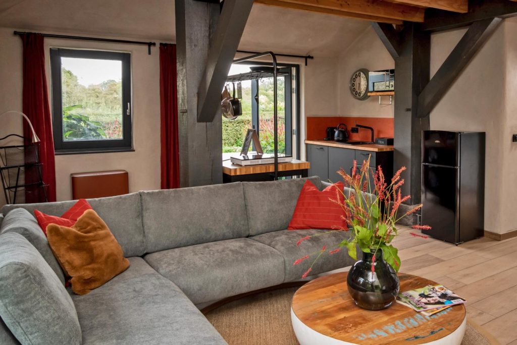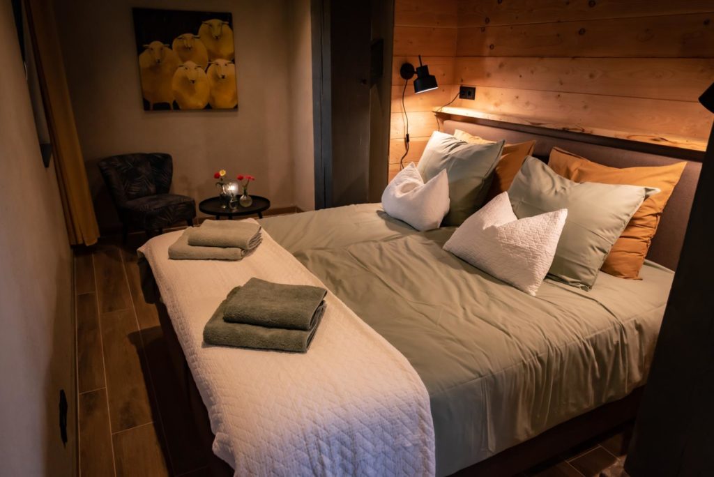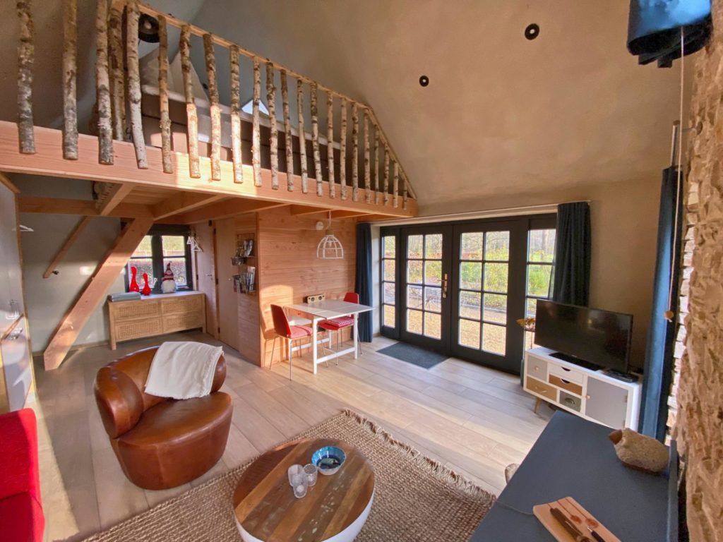 Dat is perfect gelukt. Rechts van de entree is de eerste badkamer, links de eerste slaapkamer. Daar vormen twee stelten als het ware het hoofdbord voor het royale tweepersoonsbed. Daar waar vroeger de schapen lammerden, is nu de keuken. De wenteltrap in de hoek van de living voert naar de tweede badkamer (met vrijstaand bad) en slaapkamer. Aan alles merk je dat Inge en Peter veel liefde en aandacht in het landgoed stoppen. Bij de huisjes zijn inmiddels terrassen en hagen, bij de poel hebben ze moeraseiken aangeplant.