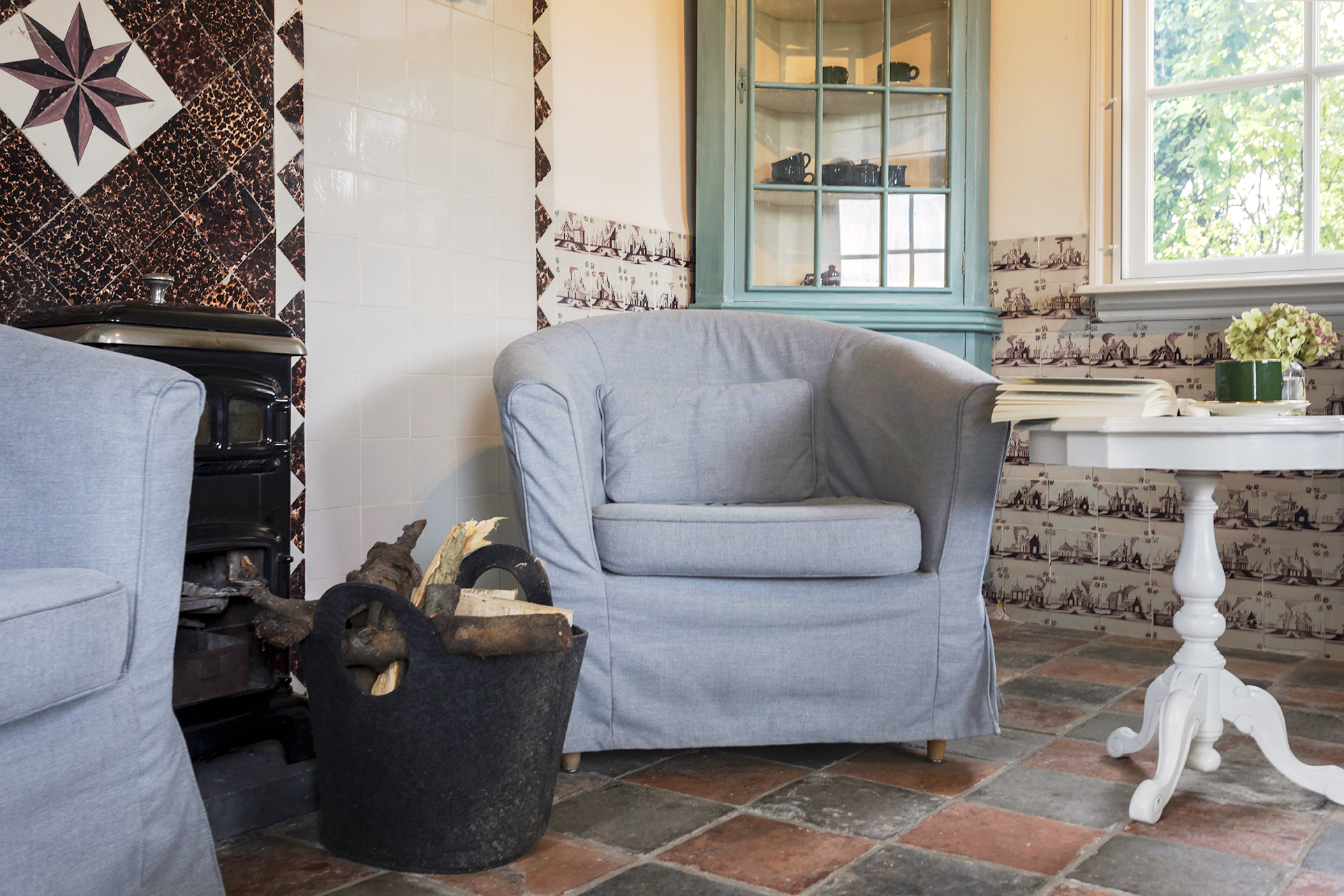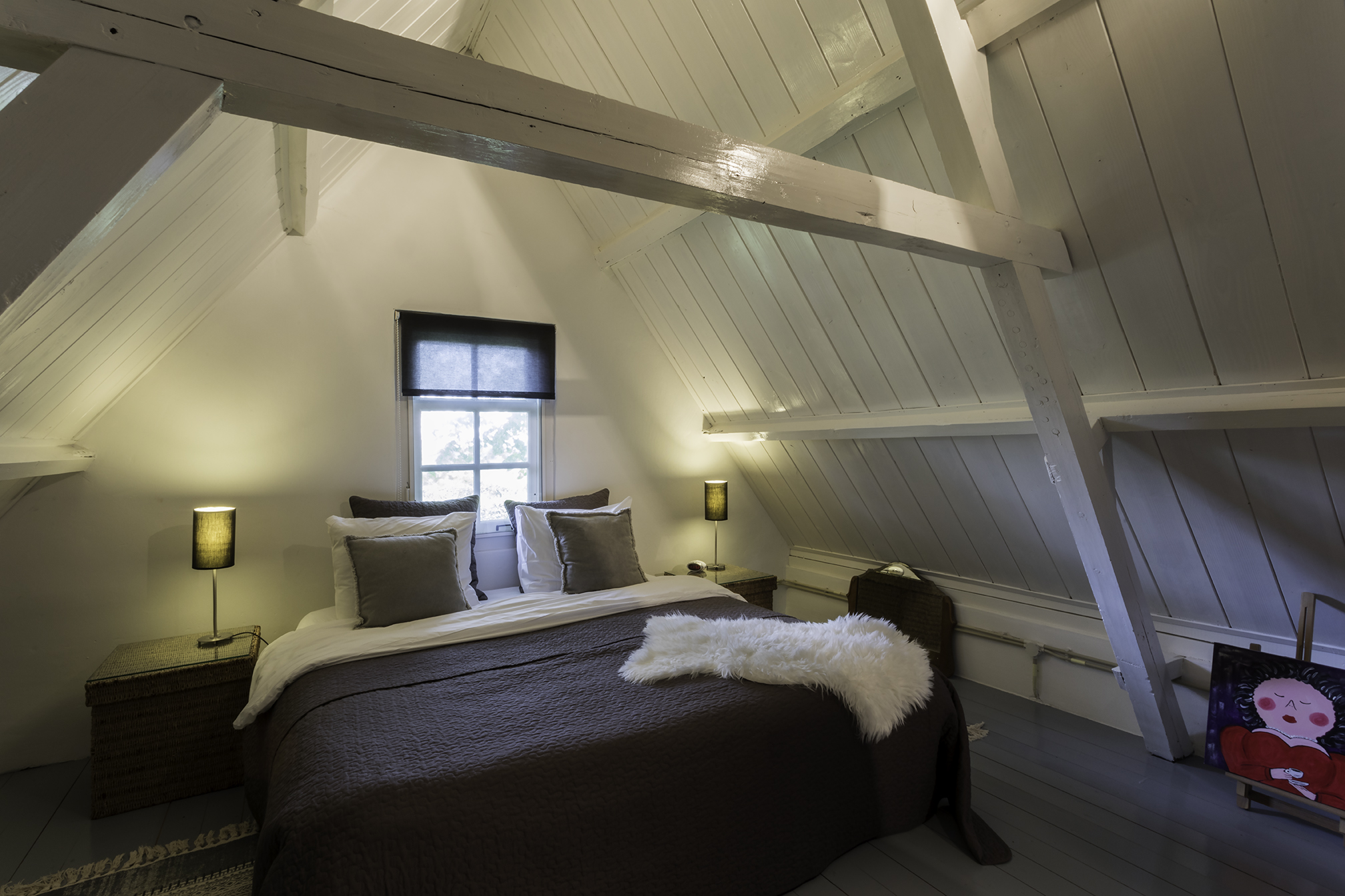 Het vrijstaande, geheel gerenoveerde huisje doet sprookjesachtig aan. Als je binnenstapt moet je even opletten, de deurlijst is wat laag. Binnen, in de woonkamer, weet je eigenlijk niet waar je het eerst moet kijken. Er ligt een prachtige oude plavuizen vloer, robuuste balken sieren het plafond en de muur heeft een lambrisering van eeuwenoude tegels. Blikvanger in de zitkamer is de bakstenen schoorsteen met ingebouwde wasketel. De inrichting is in brocante-stijl, en heel persoonlijk gemaakt met mooie familiestukken Een steile trap voert naar de slaapzolder, waar een fijn tweepersoonsbed en drie eenpersoonsbedden staan. Naast de zitkamer vind je een eenvoudige keuken en douche met toilet.