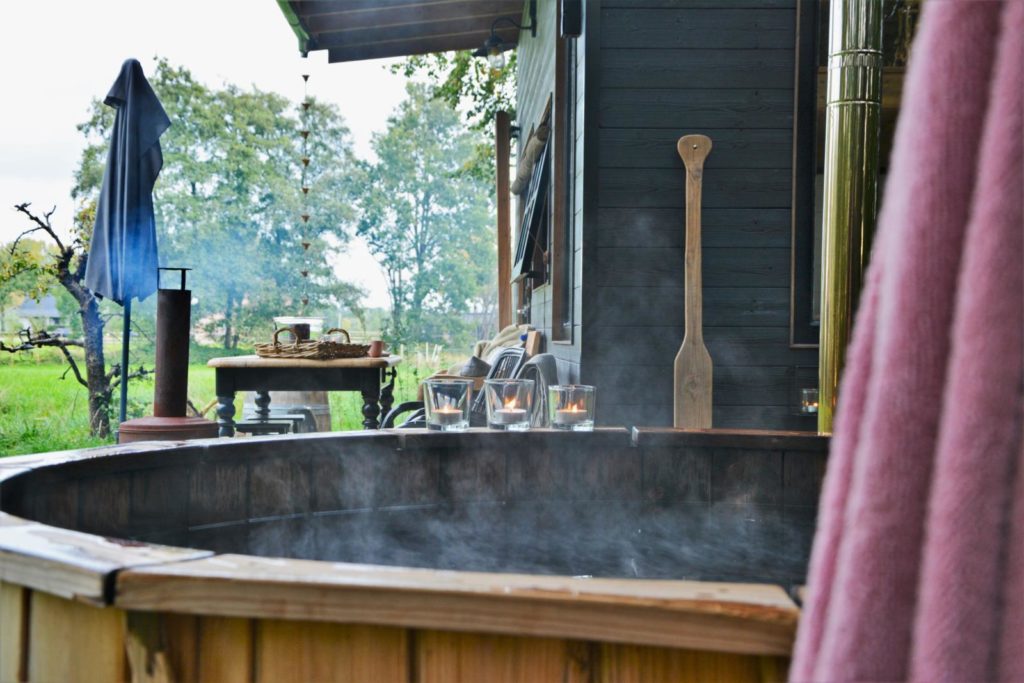 Vanuit je bed kijk je uit op de ‘barrelsauna’. En er is een hottub, met uitzicht op het weiland.
