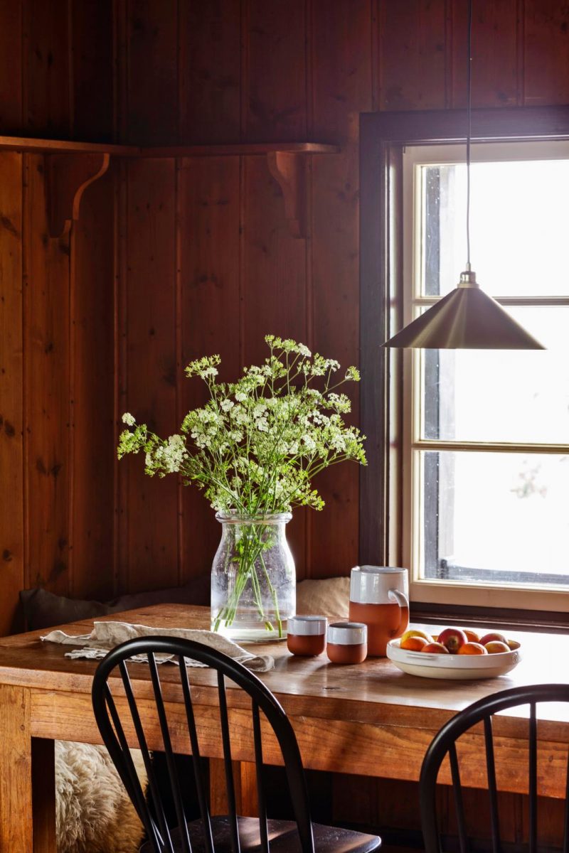 De Lemelerberg is een officieel natuurgebied. Daarom is er geen riolering of water-, elektriciteit- of gasaansluiting. “Je leeft hier echt ‘off-grid’, aldus Marianne. “Slow living dus, daar is het huis ook op ingericht. We hebben alleen aangepast wat nodig was, met materialen die passen bij het chalet. De houtkachel op de benedenverdieping stond er bijvoorbeeld al. De wanden beneden zijn authentiek, net als de vloer. Boven hebben we die alleen geschuurd en gelakt. Bij het creëren van de slaapkamers is wel dakisolatie aangebracht, simpelweg omdat het er anders te koud zou zijn.” Het interieur is basic, puur, in Shakerstijl. Zoals de comfortabele, met linnen beklede bank, fijne rotan fauteuil en eenvoudige houten stoelen om de tafel. Vroeger gebruikten de bewoners gasverlichting, nu is er elektriciteit, dankzij zonnepanelen op de veranda-overkapping. Er is een toilet, een wastafel en stromend water op basis van gefilterd regenwater. Douchen kan op de nabijgelegen natuurcamping en extra drinkwater haal je – als de aanwezige jerrycans leeg zijn – met de bolderwagen bij de boer onder aan de berg.