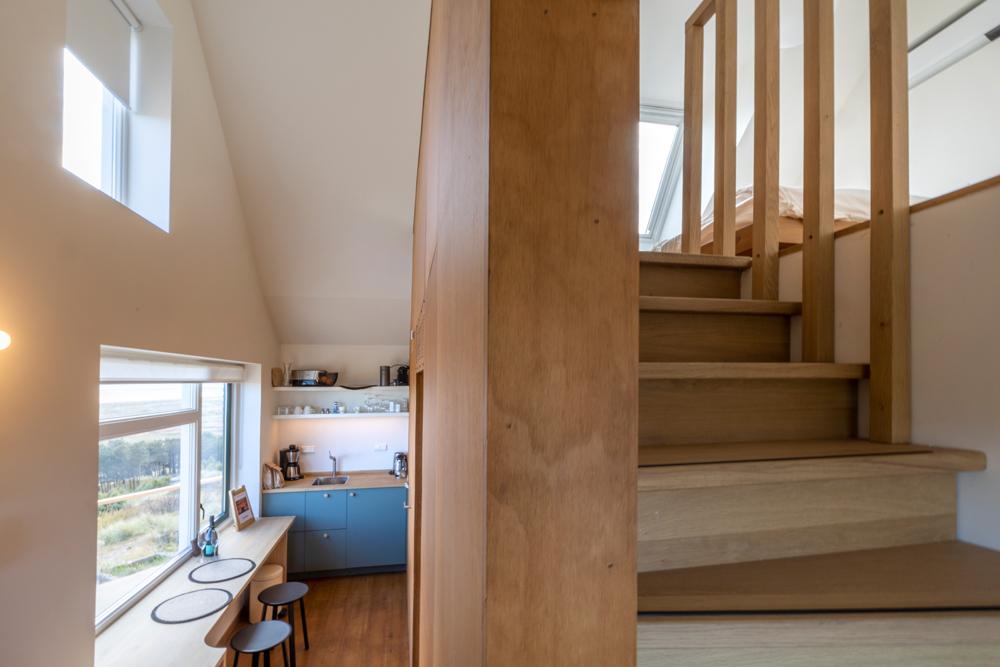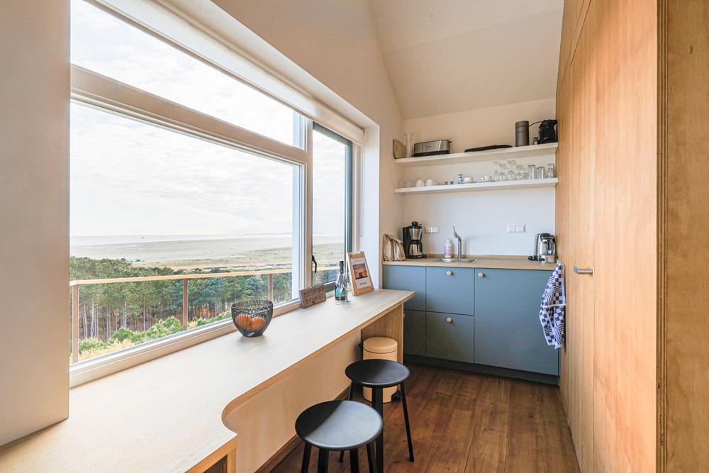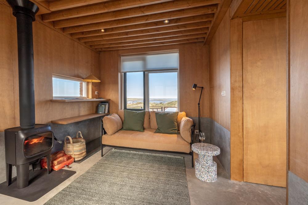 Binnen oogt Seinhuisje groter dan je zou verwachten. De indeling en inrichting zijn even slim als efficiënt. De materialen en kleuren zijn afgestemd op het natuurbelevingsgevoel: ze ondersteunen op subtiele wijze de vensters op het eiland. Meteen links is de pantry, met een zitje waar je kunt ontbijten en uitkijken richting de Waddenzee. Via een doorgang tussen het toilet en de badkamer door kom je in de living. Daar zijn maar liefst drie ramen. Links en rechts van de houtkachel zijn glasplaten in de vloer aangebracht, waardoor je in de voormalige munitiekamers van de bunker kunt kijken. Nog een verrassing, vernuftig weggewerkt onder de vloer: een fijn ligbad. Kwestie van luiken openen, kraan opendraaien en badderen maar. ’s Avonds met uitzicht op de sterren! De slaapkamer boven heeft een groot dakraam dat uitkijkt op het westelijk deel van het eiland. Bij helder weer kijk je over de ruige natuur van Noordvaarder en het wad tot Vlieland aan toe.