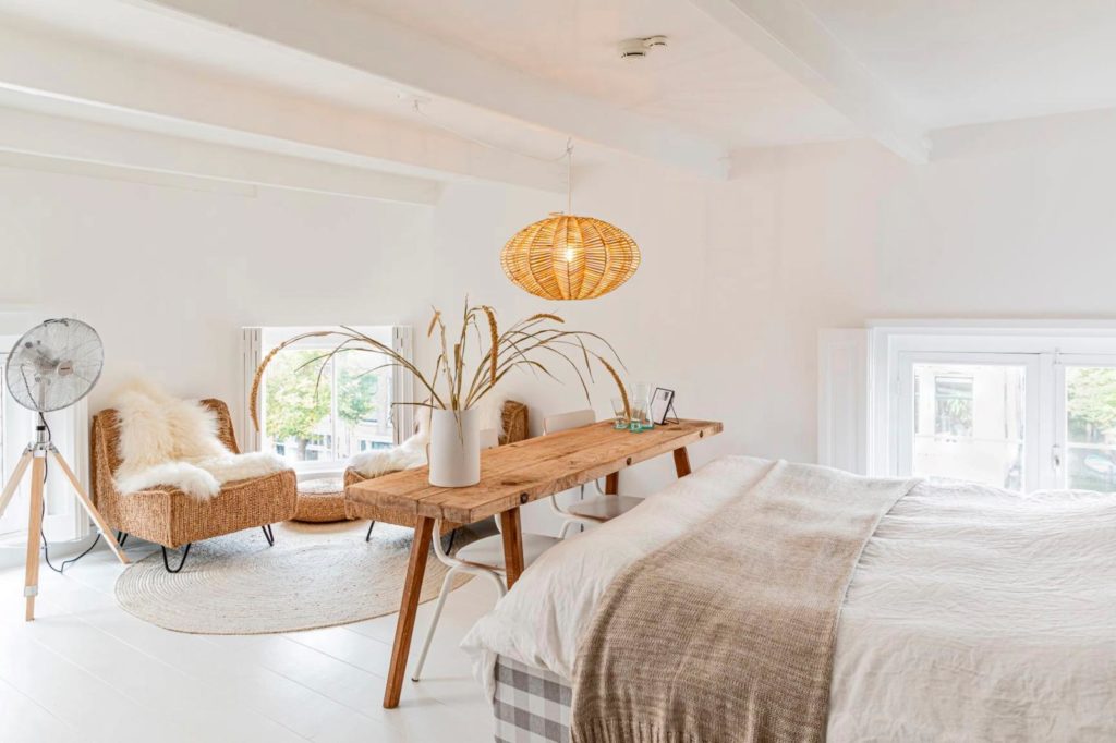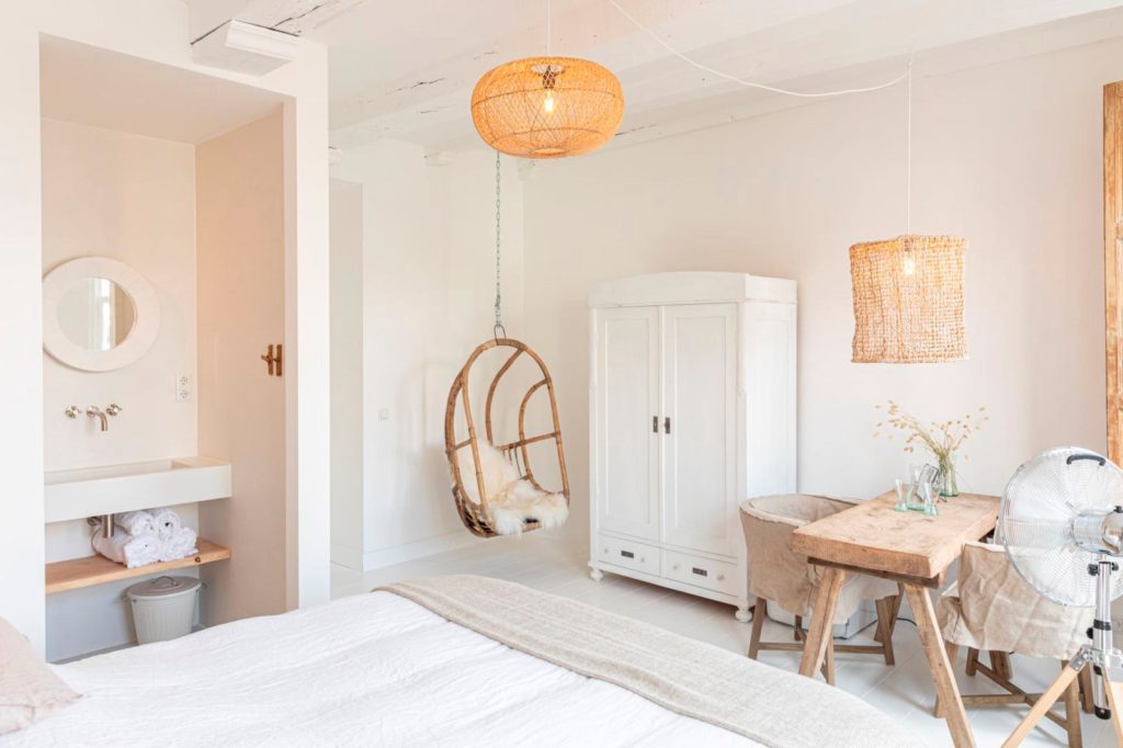 Ze deden een bod en kochten ook nog een huis op loopafstand. Daarna moest er heel veel geregeld worden: de gezinsverhuizing naar Nederland, een architect vinden, het concept uitwerken. “Geert ging in 2019 als eerste naar Nederland om de verbouwing te begeleiden. De inrichting is mijn werk. Op gevoel wist ik precies wat ik wilde, ook qua indeling van ons drie-in-één-concept. Het begon met licht. Daarom is de basis wit, aangevuld met naturelle kleuren. Alle materialen zijn natuurlijk: hout en staal, geen kunststof. In een loods verzamelde ik oude bouwmaterialen: balken, luiken, kasten, een oude slagerstafel. Per kamer had ik geteld wat we ongeveer nodig had- den, wat waar kwam, wist ik nog niet.”