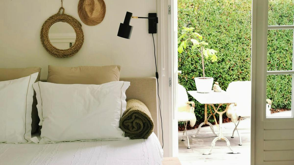 Hoe haar B&B moest worden, had ze ook al precies in haar hoofd: een smaakvolle, lichte inrichting met een luxe bed, een ruime badkamer en een pantry waar je koffie en thee kunt zetten. De vintage meubels sprokkelde Evelien bij elkaar op rommelmarkten. Alleen moest er, in verband met gemeentelijke voorschriften, nog een verbinding worden gemaakt tussen het bestaande tuinhuis en hun woning. De oplossing was even uniek als eenvoudig: glas. Aan de achterzijde is de kas dicht, daar groeit een druif tegenaan en er staat een kacheltje voor minder warme dagen. Dankzij de kas komt het buitengevoel optimaal binnen en is het een heerlijk plekje geworden om een paar dagen tot rust te komen.