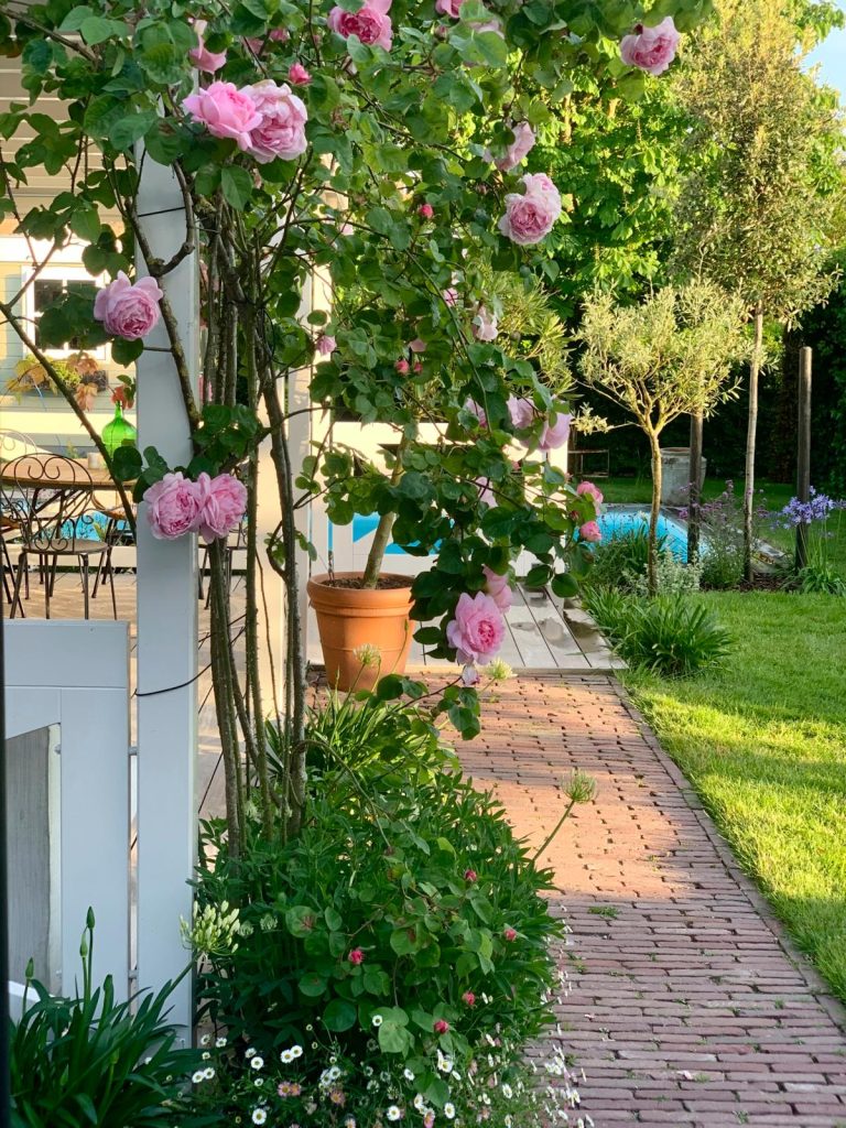 Evelien en Rob kwamen hier ruim twintig jaar terug wonen. Een enorm kassencomplex aan de rand van de stad maakte plaats voor tientallen woningen met grote tuinen. Evelien: “Toen ik dat in de krant las, heb ik meteen gereageerd. We woonden in het oude centrum en houden allebei van vrijheid. Zodoende viel onze keus op deze ruime kavel.” Van origine is Evelien verpleegkundige, ook werkte ze jarenlang in de horeca en runde een bloemenwinkel en een interieurwinkel. De wens om een B&B te beginnen was er altijd al. Het juiste moment was toen hun dochter in 2019 de deur uitging. “Dit past goed bij me: een gezellige sfeer creëren, mensen in de watten leggen, lekkere ontbijtjes serveren. Al mijn ervaring – met interieur, groen en horeca – komt hier samen.”