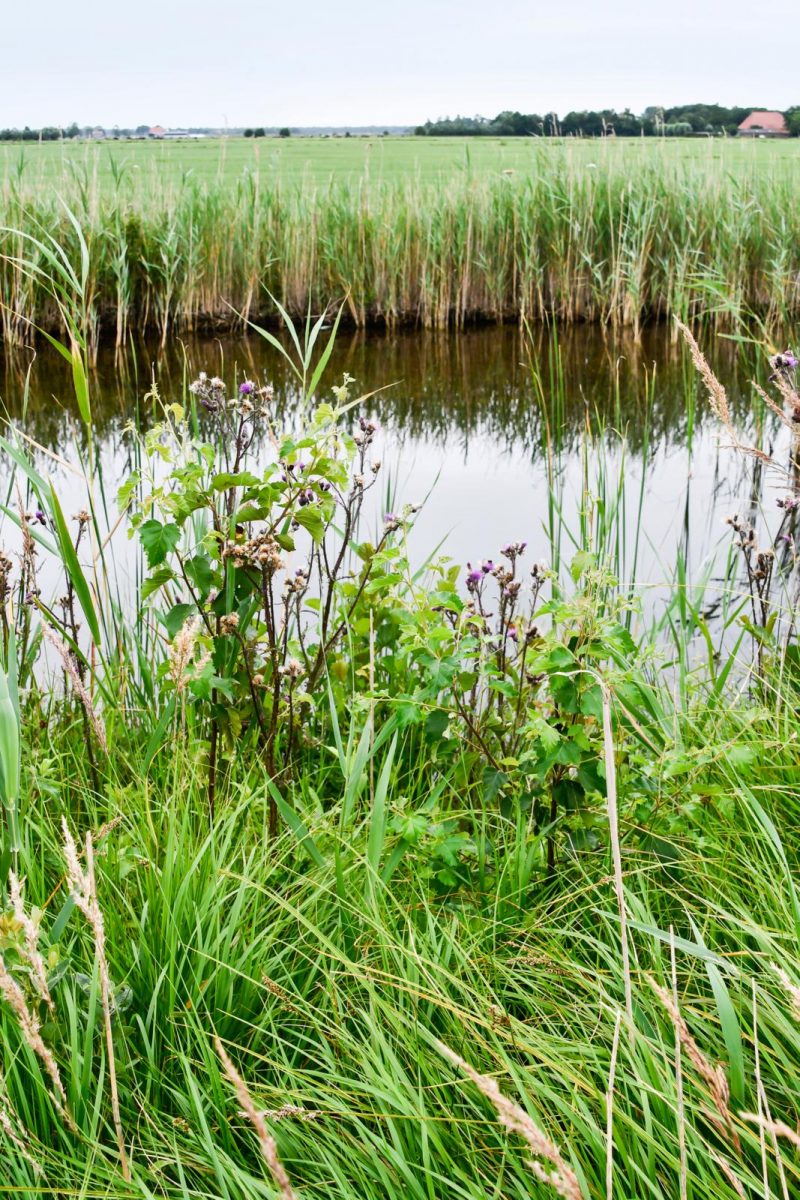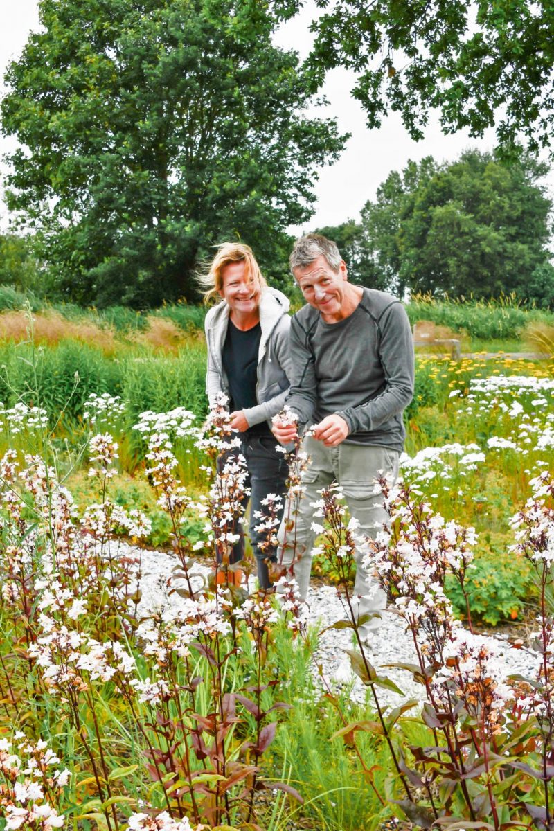 Het was nota bene tijdens een reis naar New York, tussen wolkenkrabbers en druk verkeer, dat het idee voor een prairietuin ontstond. Wybren Jaarsma en Petra Boorsma bezochten er The High Line, een oud spoor waarop een park is aangelegd, ontworpen door Piet Oudolf. Zijn gebruik van verschillende soorten siergrassen sprak het stel aan en ze raakten gecharmeerd van prairietuinen. Tijdens de bouw van hun nieuwe huis in Langelille gingen de twee dan ook op zoek naar een tuinontwerper in de stijl van Oudolf en zo kwamen ze bij Lianne Pot terecht. Lianne is collectiehouder van siergrassen en heeft zich gespecialiseerd in prairietuinen en -beplanting. Wybren: “Lianne heeft heel goed gekeken naar de omgeving en paste de beplanting van onze tuin daarop aan. De natuurlijke uitstraling van de diverse soorten siergrassen en vaste planten gaat moeiteloos over in het Friese landschap, wat ik erg mooi vind.” Het weiland achter het huis heeft aan weerszijden petgaten; dit zijn eeuwenoude vennen die behoren tot beschermd natuurgebied. Zowel de petgaten als boerensloten hebben rondom een begroeiing van wilde bloemen als roze kattenstaarten, hoge grassen en wuivend riet. Dit ecologische plaatje past helemaal bij de nieuwe tuin van Wybren en Petra. Hoewel de architect van het huis een ander plan had, namelijk een klassieke tuin inclusief een rechte oprijlaan richting de voordeur, volgden Wybren en Petra hun gevoel en kozen voor natuurlijk ogende ronde paden. Nu de planten en grassen beginnen te groeien wordt het effect van deze rondingen ook merkbaar. Je overziet niet in een keer de hele tuin waardoor het steeds verrassend blijft om erdoorheen te lopen. De paden tekende Wybren overigens zelf en zijn plattegrond was voor Lianne een goed uitgangspunt om de tuin verder vorm te geven.