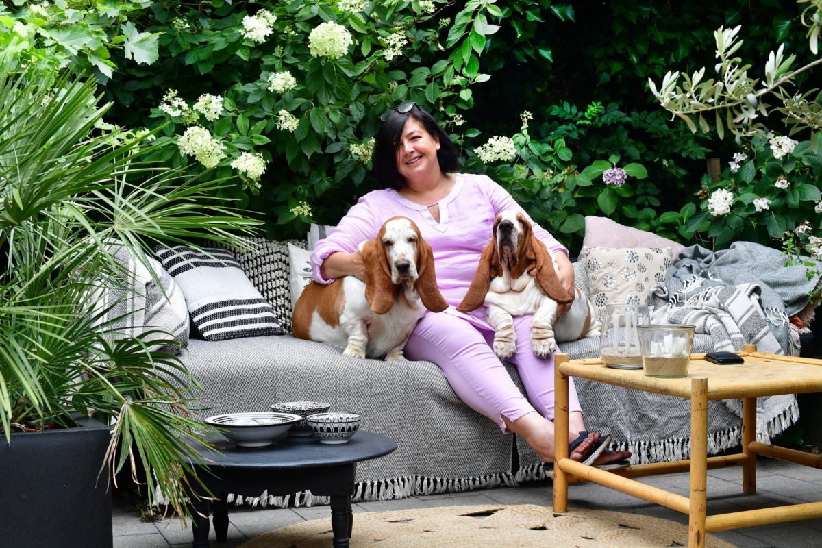 Als op een zonnige dag de thermometer de dertig aantikt, kost het je in Thea’s tuin geen enkele moeite om je in Marrakech te wanen. De traditionele riads met prachtige binnentuinen, de soeks met handgemaakte meubels, kleden, kussens en lampen, de vele dakterrassen waar potten met cactussen en vetplanten staan. “Ik ben verliefd op die stijl”, zegt Thea die vijf jaar geleden een trip maakte naar deze Marokkaanse stad. En omdat haar hoofd nooit stilstaat als het om styling gaat, heeft ze nieuwe ideeën voor deze hoek. “Ik heb nu plaids gegooid over een oude bank van steigerhout, maar wil hier een zacht daybed van maken, met beschutting aan de bovenkant. Zodat als je thuiskomt van je werk, je hier even een dutje kunt doen onder de pluimhortensia.”