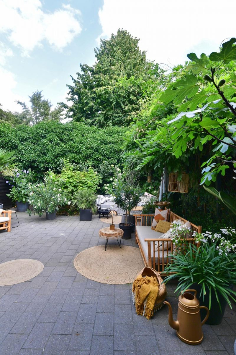 Toen Thea en Paul vijftien jaar geleden hier kwamen wonen, zag de tuin er heel anders uit. Thea: “Er lag gras, en er stond een witte schutting waar klimop tegenaan groeide. In het midden piekte een dennenboom van zes meter die veel licht wegnam. Die hebben we als eerste laten weghalen. Ik wilde een tuin die weinig onderhoud vergde, dus lieten we alles betegelen.” Ze plantte een blauweregen die samen met de klimop in een paar jaar ontplofte en van de tuin een groene oase maakte. Daarnaast koos ze voor bloeiers in potten. “Het fijne hiervan is dat je ermee kan schuiven. En door verschillende soorten groen – van klein tot groot en van stam tot struik – naast elkaar te plaatsen, creëer je diepte. En als je dan ook nog kiest voor groenblijvende exemplaren geniet je het hele jaar rond van het uitzicht op je tuin.”
