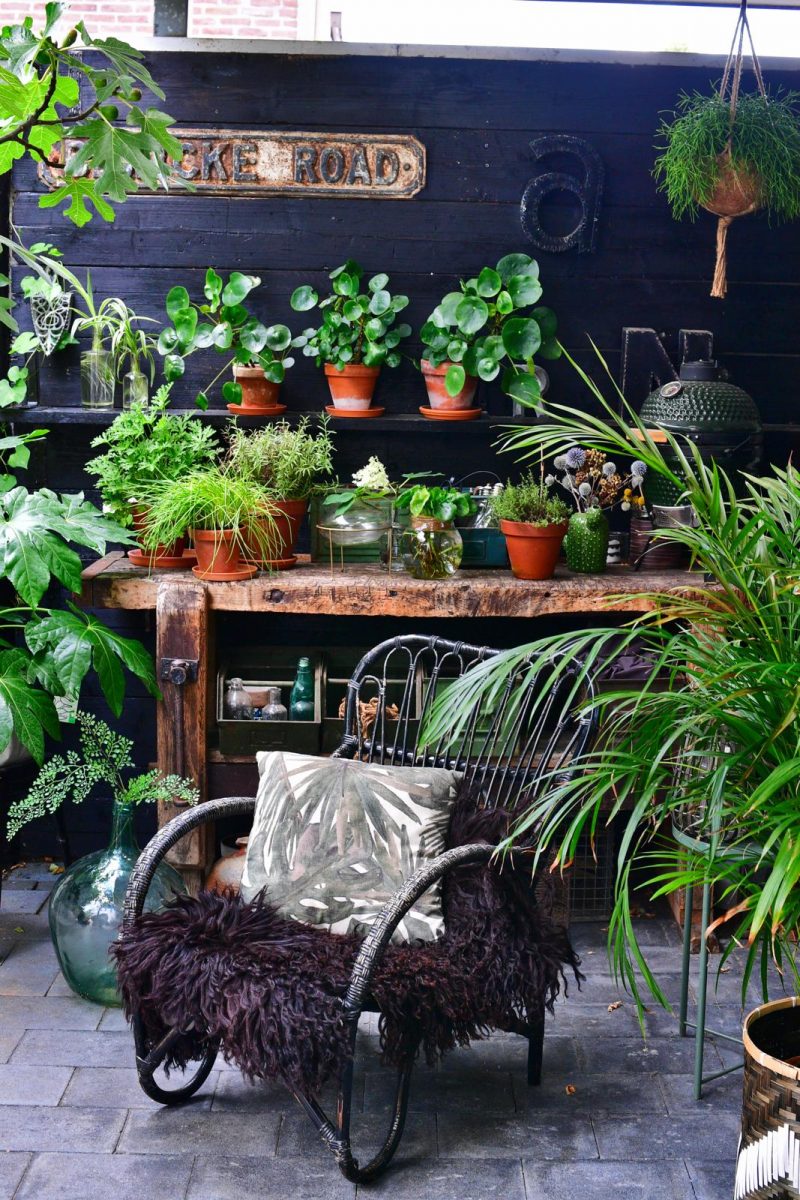 Een eyecatcher is de oude werkbank onder de overkapping. Paul vond die op Marktplaats. Eigenlijk had Thea er een andere bestemming voor in gedachten. “Ik wil er twee wasbakken op bevestigen en ’m dan in de badkamer plaatsen. Maar die moet eerst nog betegeld worden, vandaar dat-ie nu al twee jaar hier staat.” Waar hij een dankbare taak vervult als opslagplaats voor tuingerei als schepjes, touw en potgrond. Hier stekt ze haar graslelie, citroengeranium en pannenkoekplant, staan verse rozemarijn, bieslook en tijm naast gedroogde distels en krijgt een afgevallen tak van de pluimhortensia een tweede kans in een vaasje. Thea: “Door buiten kamerplanten neer te zetten, verleng ik de woonkamer. En dankzij de overkapping kunnen ze het hele jaar hier staan, behalve als er vorst voorspeld is.” Lees ook: Buitenkijker: dwalen door een weelderige cottagetuin