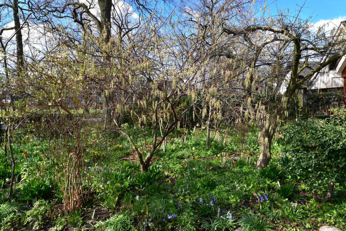 De staartaar (Stachyurus praecox) staat eind februari in volle bloei in de voortuin. Het ondertapijt bestaat uit verschillende stinzenbolletjes als sneeuwroem, sneeuwklokjes, winterakoniet en vingerhelmbloem.