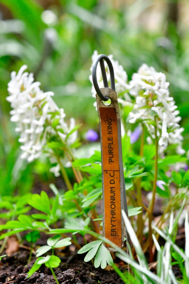 De labels zijn zelfgemaakt van oude luxaflex. Op de achtergrond bloeit witte holwortel (Corydalis cava bulbosa).