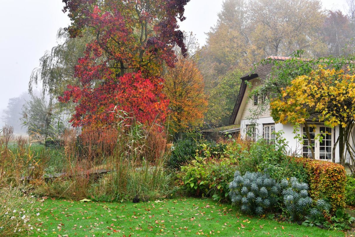 De bloemenborders geven ook aan het eind van de herfst nog steeds kleur. Laatbloeiers als Salvia âPhyllis Fancyâ en âHot Lipsâ, Persicaria âBlackfieldâ en de laatste rozerode afrikaantjes buitelen over elkaar heen. Overal staan ook decoratieve zaaddozen. De egeltjes van Echinacea purpurea, Agastache-borsteltjes, de goudbruine halmen van Verbena hastata en allerlei siergrassenpluimen.