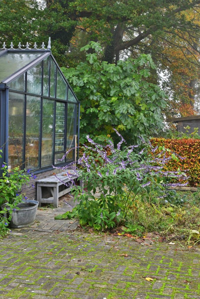 Naast de kas bloeit een Salvia âPhyllis Fancyâ.