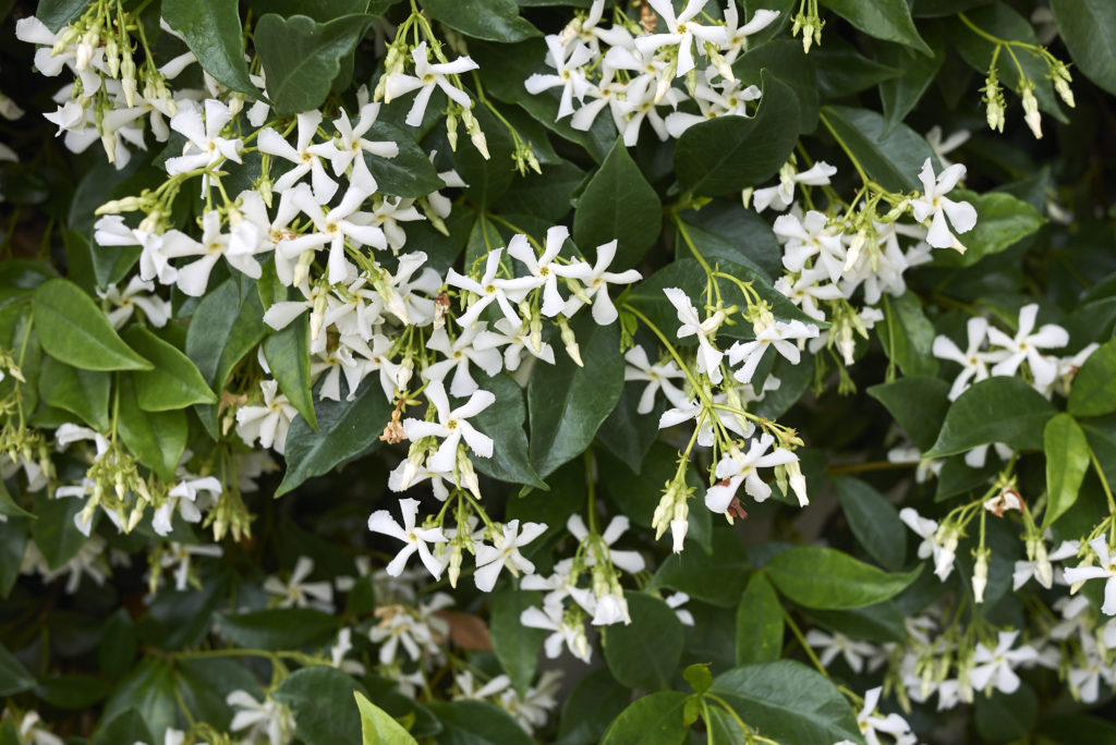 Een andere klimplant is de Toscaanse jasmijn en deze plant vraagt niet om een dakpan om koude voeten koud te houden. Het is een groenblijvende klimplant en de bloemen ruiken heerlijk!