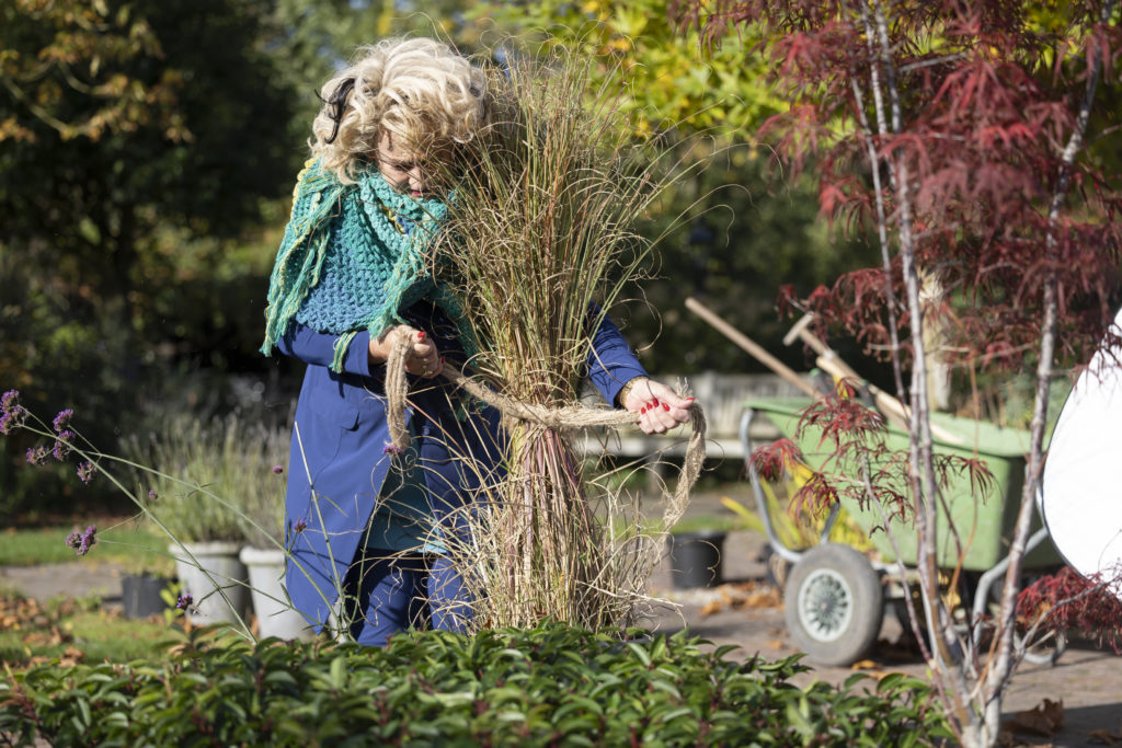 Zo zag ik dat hij de siergrassen met een jute zak opbond. De grote bossen rietachtige siergrassen werden zorgvuldig door zijn sterke armen bij elkaar gedrukt waarna er een klein touwtje omheen werd geknoopt. Daarna kwam er een jute zak omheen, dat ook weer vastgeknoopt werd met een touwtje. Vol bewondering keek ik naar zijn nogal ouderwetse aanpak. Zo deed oom Jacob van tuinvriendin Suus de rozen ook altijd. Het geeft isolatie tegen de vorst en is een goede windbreker. En de beste man was een aardappelteler dus hij had jute zakken genoeg!