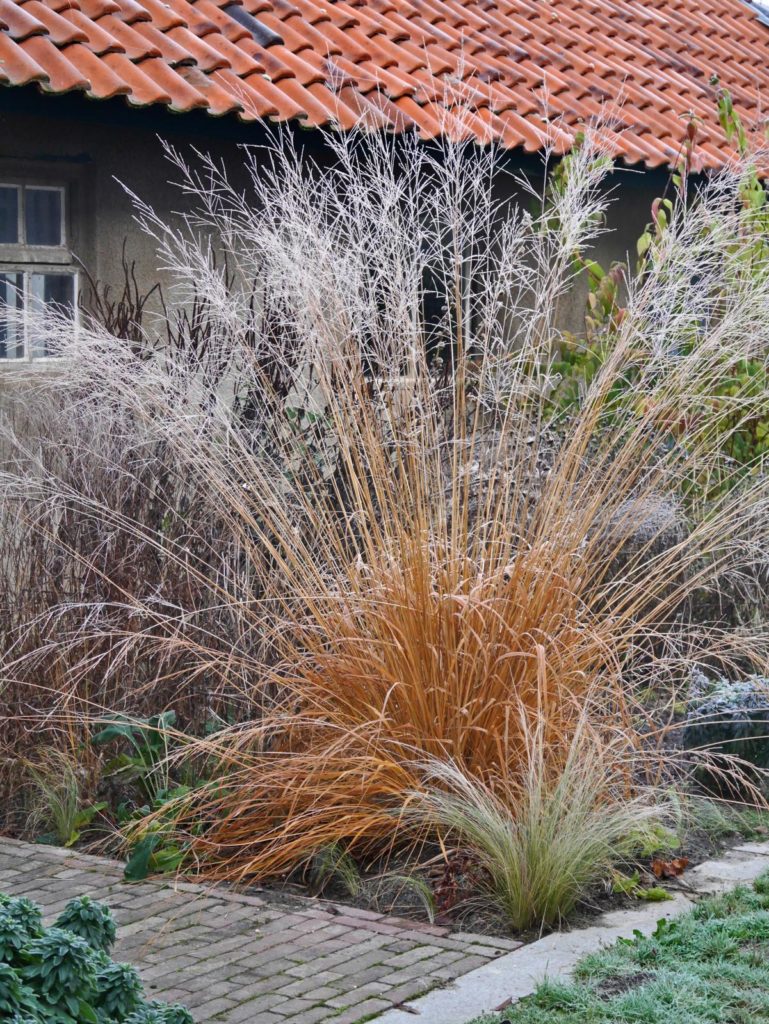 “Molinia heeft weinig onderhoud nodig. Als de bloeihalmen in de winter omwaaien en languit in de border liggen, kun je ze verwijderen. De beige bladmassa blijft de hele winter interessant. Andere planten steken er namelijk goed tegen af, zoals de zwarte zaadpeulen van valse indigo (Baptisia). Verwijder het afgestorven blad pas in het voorjaar zodat het fris opkomende, groene blad de ruimte krijgt.”