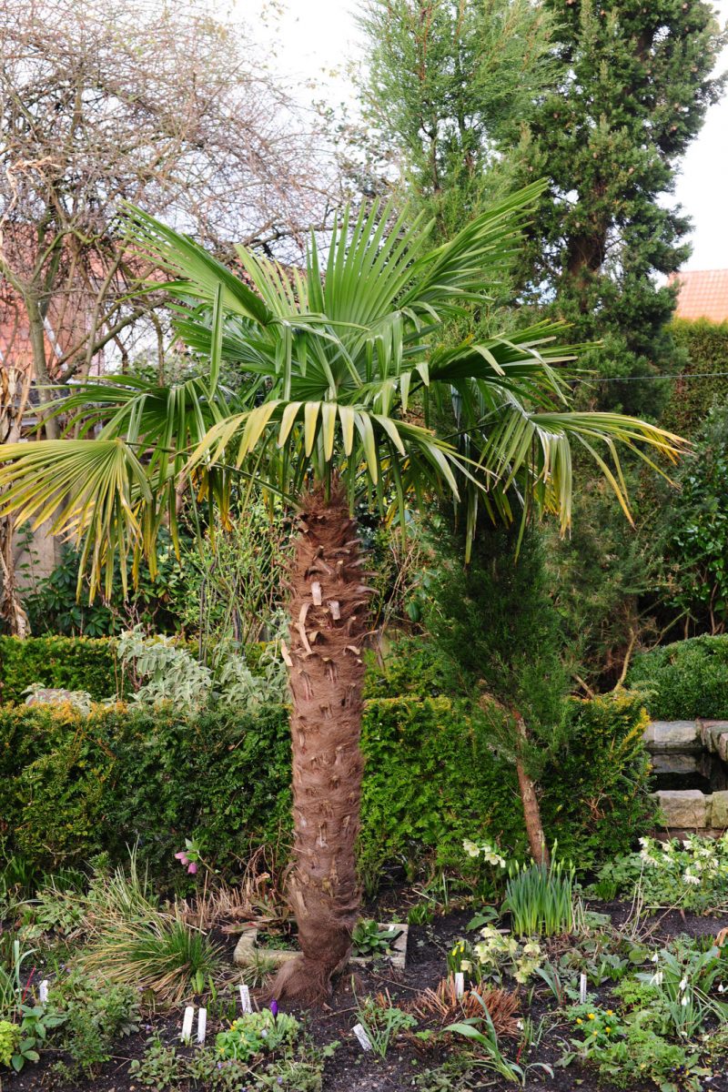 Berts allereerste palmboom, een Chinese waaierpalm (Trachycarpus fortunei), kocht hij 35 jaar geleden. Ernaast groeit een wintergroene cipres.
