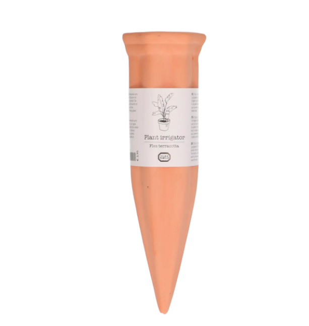 Wil je geen aparte pot aanschaffen? Koop dan een waterdruppelaar/irrigator. Die zijn er in verschillende soorten materiaal, van plastic tot glas tot terracotta, en in verschillende groottes. Op de video hieronder een exemplaar van De Wiltfang waarop je een wijnfles kunt zetten – dan houdt je plant het heus wel even uit zonder jou. Ook bij Dille & Kamille verkopen ze deze handige watervoorzieners. Of koop via bol.com meteen een heel druppelsysteem van Biogreen.