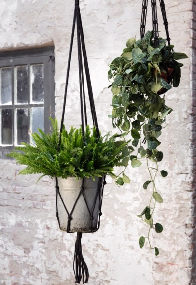 Handgeknoopte hanger, €48,- Plantenkrukje €42,- Plantenkruk, €69,-