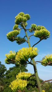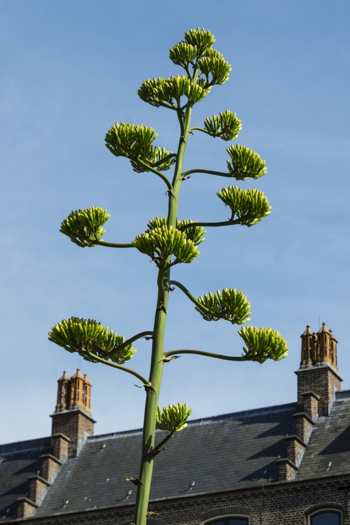 Bijzonder nieuws van de Hortus botanicus Leiden: na zestig jaar staan vier imposante Agave americana achter de Clusiustuin allemaal in bloei! Ze hebben een bloemstengel van wel een paar meter hoog, dus je kunt ze bij een bezoek niet missen.