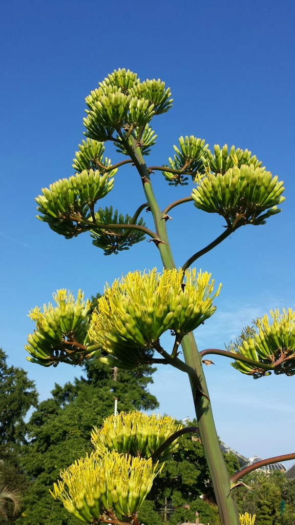 Hoe het kan dat de Agaveplanten zo spontaan zijn gaan bloeien, is een raadsel. “We wilden ze eigenlijk weg doen om de kuipplantencollectie een beetje op te ruimen voor de verbouwing en de herinrichting van de voortuin. Het is net alsof ze dat hebben gehoord”, zegt Hoofd Kassen Rogier van Vugt lachend. “Omdat het viertal vorig jaar pas heel laat naar binnen is gehaald voor de overwintering en misschien is geschrokken is van de kille temperatuur, zou het kunnen dat ze bij het opnieuw buiten plaatsen opeens zijn gaan bloeien.” Een Agaveplant in bloei zien? Bekijk dan deze timelapse.