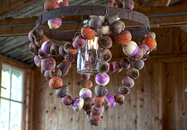 Rammenas voor een staande lamp, gekleurde wortelen als aardige kroonluchter en pastinaak en bietjes voor stijlvolle kandelaars: deze seizoensgroenten geven wij graag groen licht.