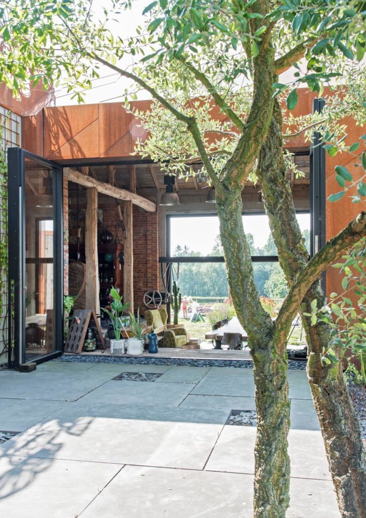 Behalve de stalen gevel, springen direct de glazen puien in de oude stal in het oog. De bewoners kozen ervoor om de tegenoverliggende oude houten poorten te vervangen door twee draaibare elementen van glas. Een brede taatsdeur opent het huis vanaf de keuken richting een beschut binnenplaatsje, de cour. Aan de overkant kan de indrukwekkende stalen pui tot boven toe geopend worden, zoals een garagedeur. “Ons idee was om een open verbinding te maken tussen huis en tuin”, vertelt Ivan, die samen met Nele een tuinontwerpbureau runt aan huis.