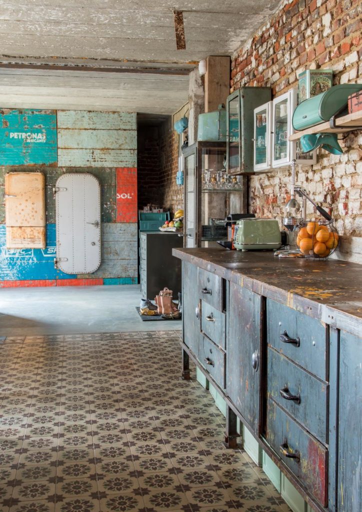 In de hoek van de keuken staat een gepimpte Ikea-kast. Ivan timmerde het hout af met oude vloerdelen. Hij viel als een blok voor de sleetse patronen. “Het liefst had ik daar de hele vloer in huis mee gelegd, maar dat ging niet in combinatie met vloerverwarming.” Nele, van huis uit grafisch ontwerper, is vaak degene die de lijnen uitzet voor een nieuw idee. Zoals voor het koelhuis in de keuken. Deze aparte koelruimte is bekleed met de platen van platgewalste drumvaten. Nele zocht de juiste kleuren en patronen bij elkaar, Ivan monteerde ze op de wanden. “Vaak puzzel ik net zo lang met de materialen tot er voor mijn gevoel balans is in kleur en vorm. In dit geval heb ik eerst een ontwerp op de computer gemaakt omdat de platen zo zwaar waren.” De ruimte is te bereiken via een oude scheepsdeur, gevonden bij een ‘salvage hunter’. “Op dat moment wisten we nog niet waarvoor hij zou dienen, maar dit pakte prachtig uit.” Er is ook een kortere route voor de dagelijkse boodschappen; die liggen verstopt achter de deur van een vintage koelkast die het stel zelf demonteerde.