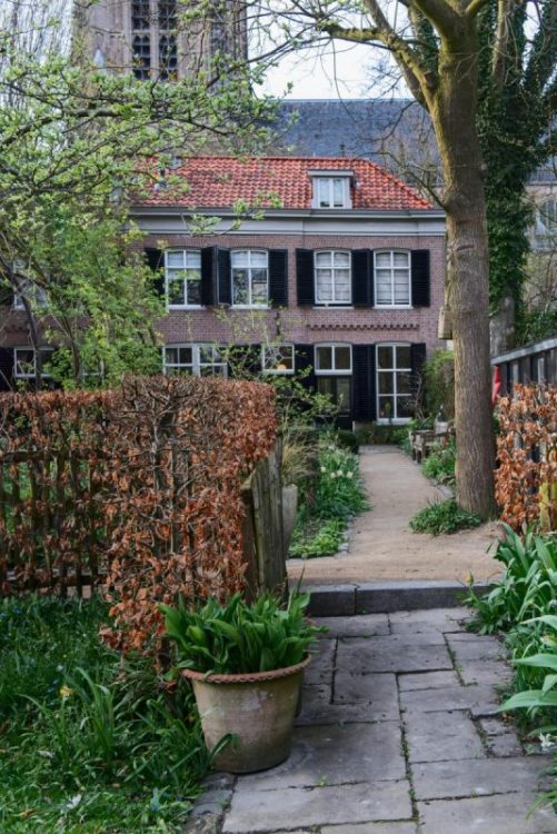 âDe achtermuur in de tuin maakt deel uit van de middeleeuwse Zalbommelse stadsmuur. Doordat de tuin grenst aan het negentiende-eeuwse Stadswallenpark kijken we uit op mooie, oude bomen. De achtergevel van ons huis is eigenlijk de voorgevel; ooit had de stadsmuur openingen en van daaruit liep je dan naar de woning. Vanuit onze tuin kijk je mooi op de Sint-Maartenskerk.â