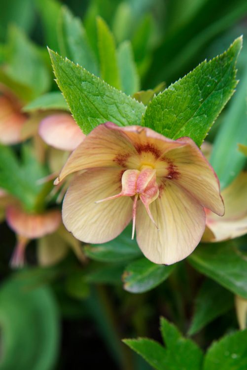 âVoor het gemak zijn de borders allemaal ingeplant met betrouwbare groene vaste planten. Ze geven ook veel structuur en vormen een mooie basis. Zo staan hier Acanthus mollis âRue Ledanâ, Lunaria rediviva, veel varens, nog veel meer helleborus, Brunnera, geranium, mansoor, Persicaria amplexicaulis en Sarcococca. Ontzettend leuk om daartussen met tulpenbollen elk jaar weer andere kleurencombinaties uit te proberen. Een favoriete vaste plant die hier overal zijn gang mag gaan, is de grote wolfsmelk, Euphorbia characias wulfenii. Het is een van de belangrijkste dragers in mijn tuin. Hij is, zeker in milde winters, wintergroen, heeft een prachtige structuur en een heel mooie bloem die altijd samen met de tulpen bloeit. Gelukkig zaait hij zich hier rijkelijk uit, waarschijnlijk omdat het hier zo kalkrijk is met al die muren rondom.â