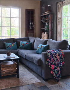 Landelijk antiek is een zwak van Kim: “Mijn ouders hebben hun stolpboerderij zelf gebouwd, met oude materialen die ze vonden bij handelaren en op veilingen. Ik ging als kind vaak met hen mee op speurtocht. De liefde voor oude spullen kreeg ik van jongs af aan mee.” Behalve enkele basisstukken als banken en bedden is vrijwel het hele interieur afkomstig van rommel- en brocantemarkten, antiekbeurzen en veilingen in België en Frankrijk. Ook putti – stenen kinderfiguurtjes – kan ze moeilijk weerstaan. Ze belanden vaak in huis, samen met andere geliefde tuinornamenten. En bij de eettafel kijkt een Frans borstbeeld op de borden, terwijl spelende putti naast de kast en op een piëdestal staan. Kleine stillevens trekken de aandacht, zoals een kralenketting rond een wandkandelaar. Over de bank ligt een bont gekleurde plaid; het zijn de accenten in roze en aqua die het grijs-beige interieur levendig maken.