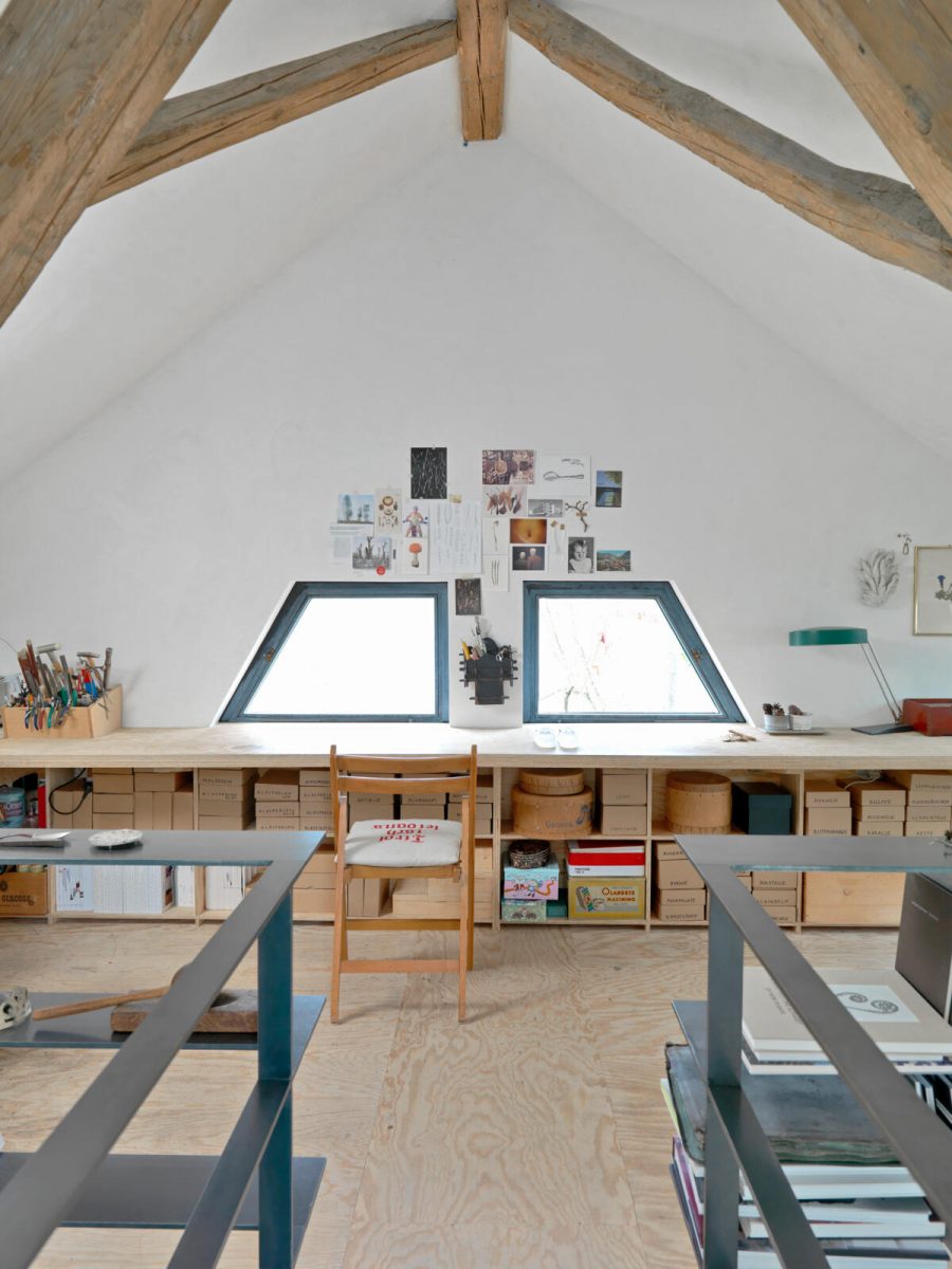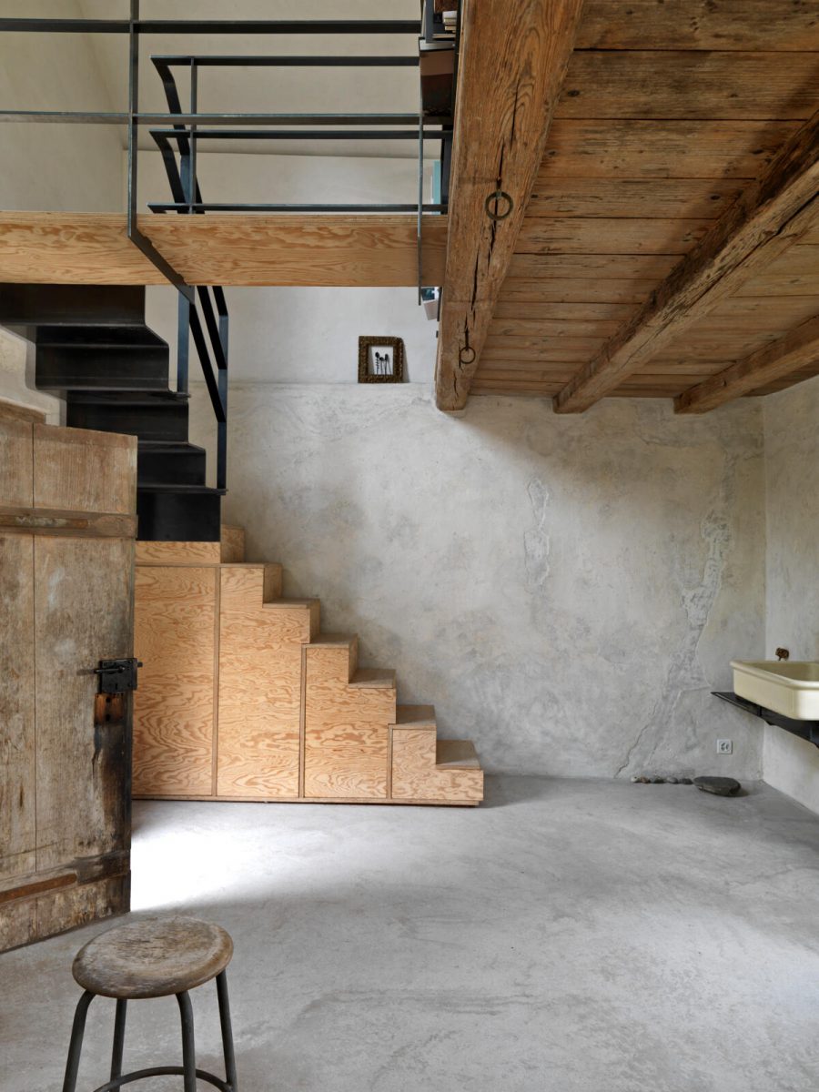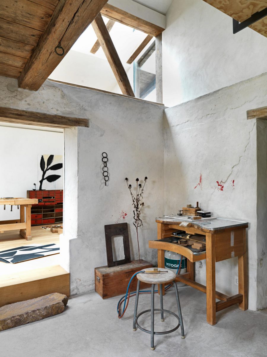 Alle muren van het atelier zijn eigenhandig gestut, gerestaureerd, gestuukt en mat afgewerkt met een mengsel van kalkmortel en water. Bewust niet al te netjes, zodat ze oud en verweerd lijken door de tijd. Beneden zorgt een nieuwe, eveneens grove betonnen vloer voor een stoere basis. Om meer licht te vangen zijn oude ramen vergroot. Ook stripten Gabi en Othmar het verlaagde, houten plafond. Een deel lieten ze echter intact. Hierdoor ontstond onder de oude balkenconstructie een mezzanine, een halfopen tussenverdieping. Een stalen plaat zorgt zowel voor stevigheid als een extra, industriële laag. “Dit was meteen mijn nieuwe lievelingsplek. Het is hier heerlijk werken aan de XL-tafel. Vanuit de cockpitramen zie ik de roodborstjes en distelvinken zitten in de boomtoppen. Soms zie ik een vos of das sluipen. En in de winter zijn er hertensporen in de sneeuw. Dankzij de rust hier kan ik me heel goed concentreren op mijn werk.” Verder lezen? Dat kan in Seasons 10.