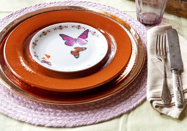 Groene tafelloper € 7,95 (Dille & Kamille). Lila placemat € 9,95 en koperen onderbord € 39,95 (Sissy-Boy). Terracotta bord € 4,95 (Dille & Kamille). Bloemenbordjes set van 6 € 12,50 (Kringloopwinkel). Paarse glaasjes set van 6 € 24,95 (Sissy-Boy). Servet € 2,25 (Dille & Kamille). Set van 6 messen. € 9,95, brocante vorken per stuk € 2,50 en plank € 45 (De Bosrand Brocan-te). Vaasje € 2,95 (Sissy-Boy).