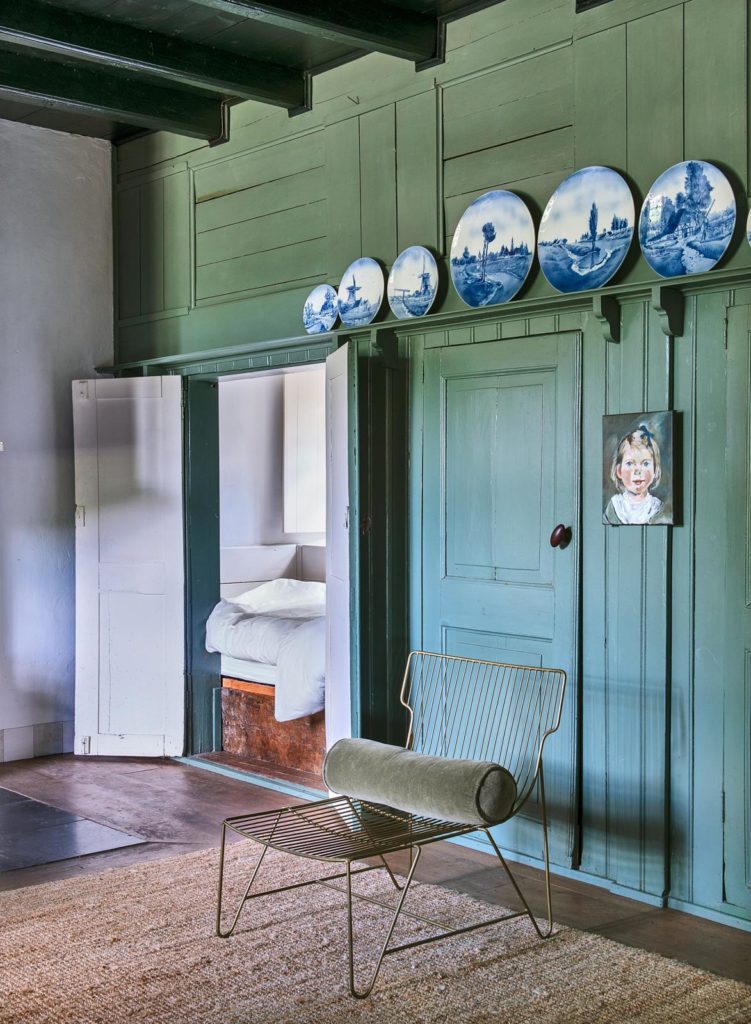 Ook bewaard gebleven zijn de oud-Hollandse kleuren in huis, zoals het bijna zwarte groen van het woonkamerplafond en het ossenbloedrood van de keukenbalken. “Die kwamen onder de platen tevoorschijn. De planken ertussen had ik eerst gebeitst, maar dat bleek veel te donker. Dus heb ik ze oker geverfd, een kleur die je veel ziet bij oude boerderijen.” De bedstedes in de woonkamer waren boerengroen. “Mooi, maar een beetje heftig. De panelen in de deuren waren lichter; ik heb die kleur zelf gemengd en er de hele wand mee geverfd.” Alle muren werden wit, lekker fris en licht. “Vroeger verfden ze die helderblauw, want vliegen hebben daar een hekel aan. Ze maakten de kleur door blauwsel aan de kalkverf toe te voegen. Ik heb het uitgeprobeerd, maar vond het niet mooi, te zwaar. Het huis is al zo donker door de leilindes die we bij de gevel hebben geplant. Dat was het eerste wat we in de tuin deden.”