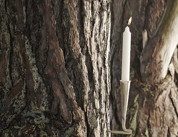Uit de wind, veilig beschut tussen dikke boomstammen, geeft deze koperkleurige kandelaar een zacht schijnsel in donkere tuinhoekjes. Met nagel aan de achterkant. www.deens.nl, €11,75