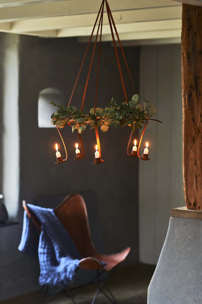 Hangkandelaar € 7,95 en kaarsjes € 5 per 10 stuks (de Weldaad). Plaid € 150 (Loods 5).