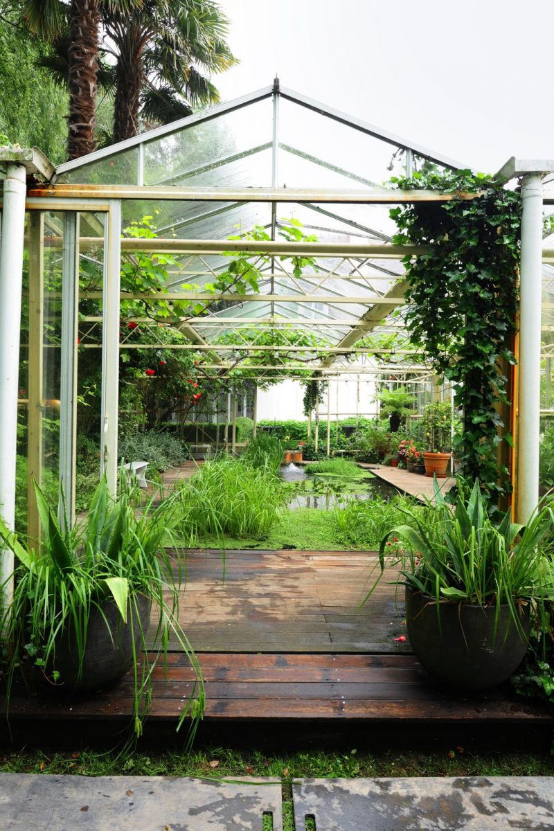 Een opvallend element in de parktuin achter de woning is de kas, die meer weg heeft van een overkapte vijver. “Dat klopt; de vijver was eerst een zwembad. Mijn moeder zwom veel en heeft die overkapping laten plaatsen om het zwemseizoen te verlengen. Door het gebruik van Belgisch hardsteen, dat in de winter bedekt raakt met mos, lijkt het alsof de vijver er al heel lang is. Maar het ligt er natuurlijk wel aan hoe je ermee omgaat”, voegt Alain toe. “Want als je het hardsteen schoonhoudt, blijft het er als nieuw uitzien. Heel proper hoeft het van mij niet te zijn.” Dat Alain een voorkeur heeft voor groenbedekking blijkt ook uit de waterlelies die in alle vijvers waterlelies groeien. “Ik zie wateroppervlakten graag bedekt. Waterlelies zijn heel gemakkelijk en komen altijd weer terug.”