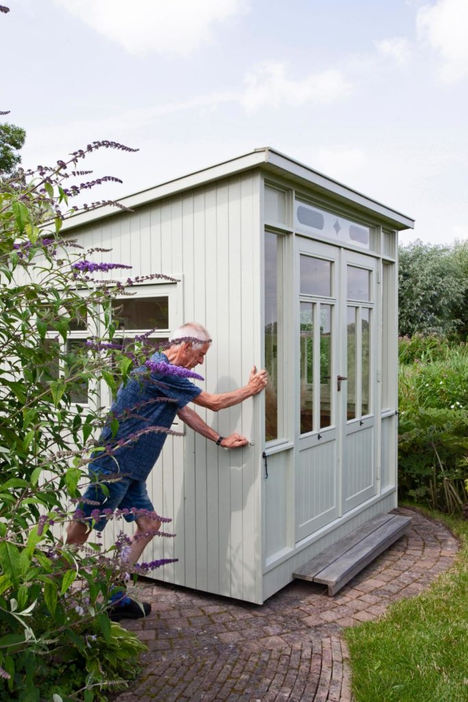 Achter in de tuin, tegen de boerenakker aan, staat het schattige tuinhuisje, met aan de voorkant grote ramen in de openslaande deuren. De zachtgroene kleur loopt over in het groen van de tuin en de wilgen die langs de sloot van de akker staan. “We wilden veel meer kunnen genieten van buiten zitten. Eerder in het voorjaar, later in het najaar en ook wilden we in de tuin kunnen zitten als het waait, en dat doet het best vaak hier”, vertelt Wim. Dat je het huisje kunt draaien was helemaal een fantastische bonus. “Zo kijken we het ene moment over het weidse Groninger landschap en het volgende moment zitten we intiem en beschut.” Wim geeft het huisje een flinke duw en duwt het rond tot het uitzicht in tegenovergestelde richting is. “We gebruiken het huisje vaak om ’s ochtends in het zonnetje in te ontbijten, de krant te lezen en koffie te drinken. Ook lunchen we er regelmatig. In de zomer als het warm is draaien we het huisje vaak uit de zon om zo in de schaduw te kunnen zitten.” Wim en Jacquelines huisje gaat op in het landschap, alsof het er altijd gestaan heeft.