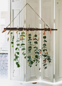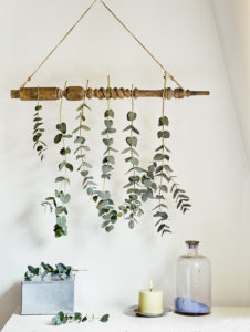 Aan een oude trapspijl zijn eucalyptustakken gebonden. De blaadjes lijken te zweven, dankzij het gebruik van doorzichtig nylondraad. Trapspijl vanaf € 10 (Leen van Velzen). Fles met pigment € 45 (Old Basics). Kaars van Fair + Fair € 9,95 (Gekaapt). Metalen bor € 4,50 (De Woonwinkel.nu).