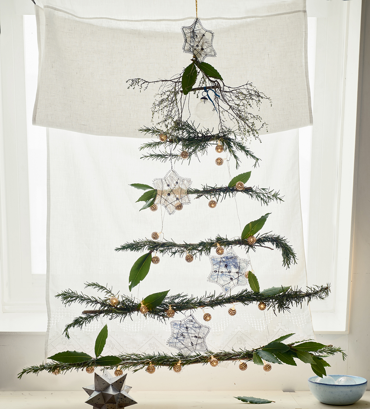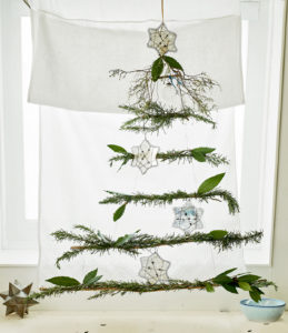 Salie, tijm en laurier verspreiden een kruidige herfstgeur in de kamer. Deze boommobile is gemaakt van zes dunne bamboetakken die met fijn ijzerdraad op gelijke afstand van elkaar zijn bevestigd. Aan de takken zijn op speelse wijze laurier-, salie- en tijmtakjes, en transparante sterren van gaas, kralen en glas geknoopt, ook met ijzerdraad. De salie, met zijn grillige vorm, is bovenin geplaatst. Kerstster € 14,50 per stuk, grote ster € 9,95 (De Weldaad). Gordijn € 25 (Jolandelijk). Kom € 8,95 (Loods 5).