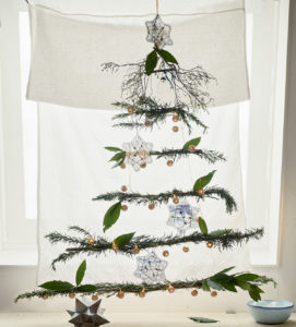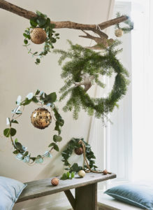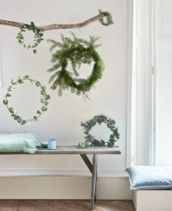Aan een flinke stok, gevonden in het bos, hangen ijle herfstkransen gemaakt van geurende dennentakken en eucalyptus. De stok is inmiddels goed droog, daardoor heeft hij een matte uitstraling. Hij is opgehangen met nylondraad, waardoor hij los in de ruimte lijkt te zweven. De kransen zijn met naturel touw aan de stok bevestigd. Plaid € 39,95, kussen € 45 (De Weldaad). Schotel € 49, kom € 99 (Sukha). Bank € 195 (Old Basics).