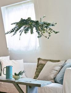 In een borduurring zijn eucalyptustakken gestoken, die in het midden zijn vastgezet met dun touw. De ring is met drie dunne touwen opgehangen, zó dat hij mooi recht hangt. Bank van Designers Guild € 3.500 (Wilhelmine van Aerssen). Tafel/bank € 195 (Old Basics). Blauw kussen € 24,95 (De Weldaad). Groen kussen € 45 (Jeanette Philipse). Kan € 19,95 (Loods 5). Sauskom € 14,50 (De Woonwinkel.nu).