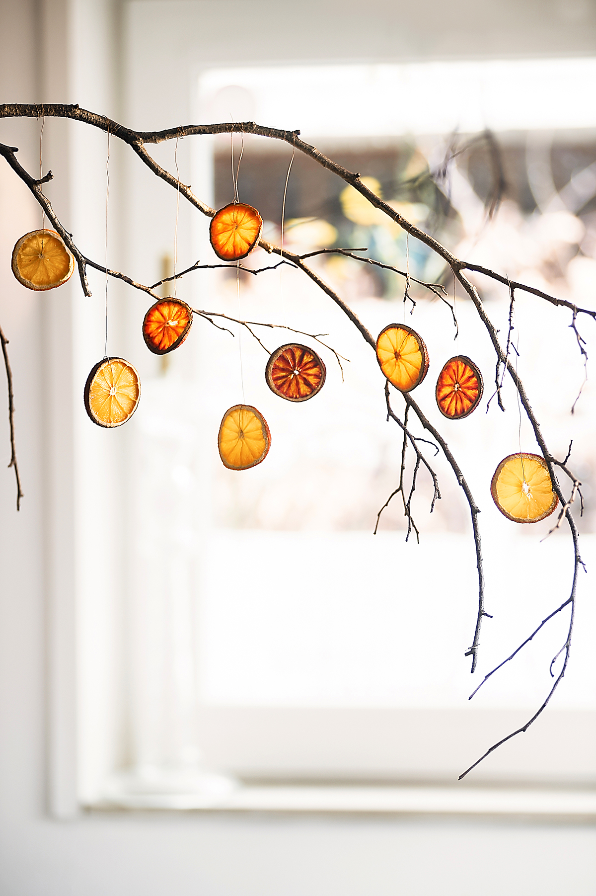 Aan een grillige tak zijn op ongelijke hoogte van elkaar gedroogde schijven sinaasappel, grapefruit en mandarijn gehangen. De plakjes fruit filteren zacht het daglicht en verspreiden een zonnige geur. Hang ze ongelijk op, met nylondraad, voor een luchtig effect.