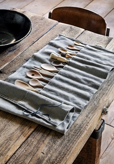 Pollepels in alle soorten en maten, kwastjes, houten spatels: ongemerkt verzamel je heel wat keukengerei die meestal in allerhande lades, potten of kastjes belandt. Gevolg: tijdens het koken kun je nooit (snel) vinden wat je zoekt. Deze oprol-etui helpt daarbij.