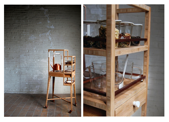 Ontwerpster Femke Roefs bedacht deze elegante ’theetrolley’. Het verrijdbare meubel is van bamboe en heeft handige opbergruimtes voor kopjes en thee. De ingebouwde warmhoudplaat is exclusief gereserveerd voor de bijbehorende handgemaakte koperen theepot. Meer weten? www.femkeroefs.nl