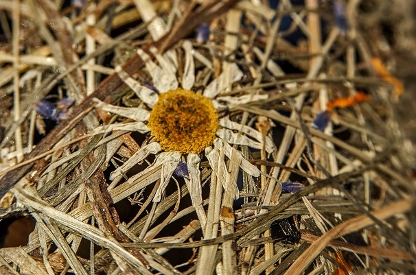 Wie goed kijkt, ontdekt ook bloemen in de hooilamp. De margrieten worden door de stoffenproducent zelf geteeld. De goudsbloemen, lavendel en zonnebloemen zijn afgekeurd voor thee- en kruidenmelanges, maar komen hier prima tot hun recht. Na het drogen worden ze stuk voor stuk met de hand in het hooimengsel gestoken alvorens dit door de pers gaat. “Elke lampenkap is uniek”, aldus Horst.
