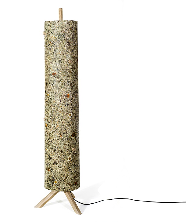Op zoek naar natuurlijke materialen voor zijn ontwerpen, stuitte Horst op het bedrijf Organoid Technologies in Fliess. Ze ontwikkelen onder meer meubeltextiel van geperst hooi, bloemen en kruiden uit de regio. “Toen ik de geur rook, stond ik direct weer in de Alpenwei. Met dit nieuwe materiaal had ik de sleutel in handen voor een nieuw soort Heumandl.” De statige vorm van het hooimannetje evolueerde op Horsts tekentafel tot een staande vloerlamp.
