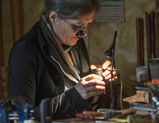 De conische boring waar je doorheen blaast moet precies goed zijn uitgeboord, van boven wijder dan van onderen. Dat komt op de tiende millimeter nauwkeurig. Een verkeerde boring laat de fluit meteen vals klinken. De afmeting van het windkanaal, het spleetje waar je doorheen blaast, luistert ook heel nauw. Hierdoor komt de luchtstroom op de rand waartegen de lucht wordt geblazen, het labium. het veroorzaakt de trillingen die de toon maken. Als je topinstrumenten wilt bouwen is het essentieel zelf ook op hoog niveau te spelen. Je moet weten hoe het werkt.” De juiste klank Ze leerde het vak van de wereldberoemde blokfluitbouwer Frederik Morgan. “Hij kwam een jaar lang les geven op het Koninklijk Conservatorium in Den Haag. In die tijd had hij een wachtlijst van acht jaar! Hij vond dat er meer blokfluitbouwers moesten komen en wilde graag een select groepje opleiden. Dat was mijn grote kans. Ik had nog nooit iets met mijn handen gemaakt en het leren draaien en bouwen kostte me veel tijd, maar ik wilde het vreselijk graag. Ik ben nog steeds niet zo superhandig, maar weet wel heel goed welke klank ik nastreef.