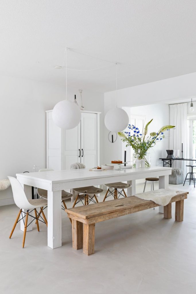 De vloer heeft de kleur greige (tussen beige en grijs in). Daarop Eames DSW-stoelen, de tafel en het bankje zijn op maat gemaakt. De lampen zijn Cotton Ball Lights van Vitra.