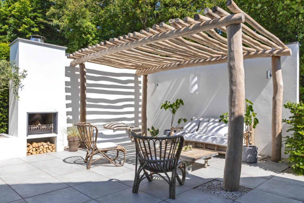 Het wit gestuukte keukenblok. Mediterrane bomen als olijf en vijg. Accessoires in warm bamboe en rotan. Maar vooral de overkapping van houten palen. Als je niet beter zou weten, zou je denken dat de foto van de heerlijke loungeplek uit een zonovergoten land afkomstig is, waar het leven vooral bestaat uit siësta’s, mañana’s en tranquilo’s – niet uit de tuin van een vrijstaand woonhuis in een wijk in Landgraaf.